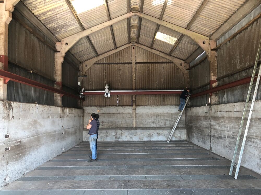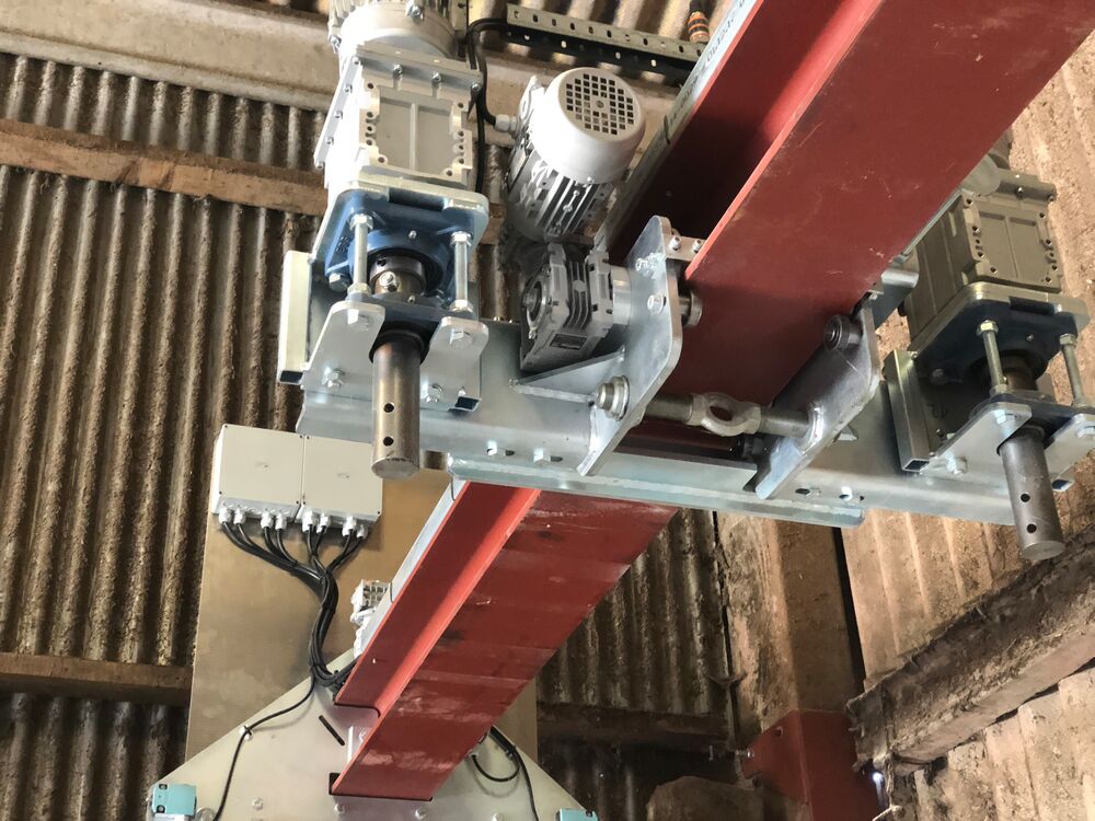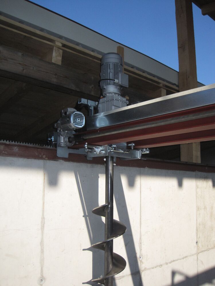 Unser ,,Aufmischer“ - ein Lagerboxen überspannender 4-Schnecken-Mischer mit Quer- und Längsfahrwerk für unterschiedliche Produkte.